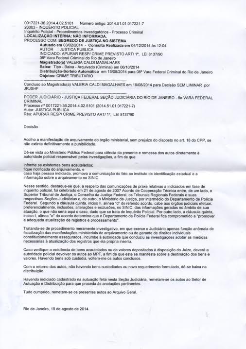 A resposta está no inquérito da Polícia Federal registrado sob número 0017221-36.2014.4.02.5101 na 8ª Vara Federal Criminal no Rio de Janeiro. Mas é impossível ter acesso a ele. O inquérito foi arquivado sob segredo de justiça. Para o público, só está disponível a decisão da juíza, que atendeu à manifestação do Ministério Público e da Polícia Federal.